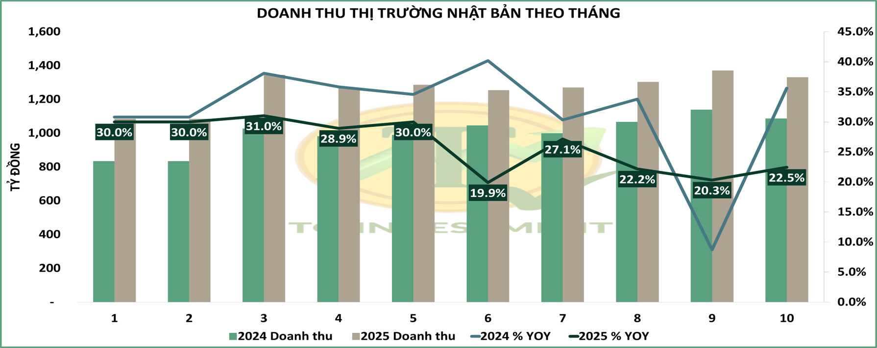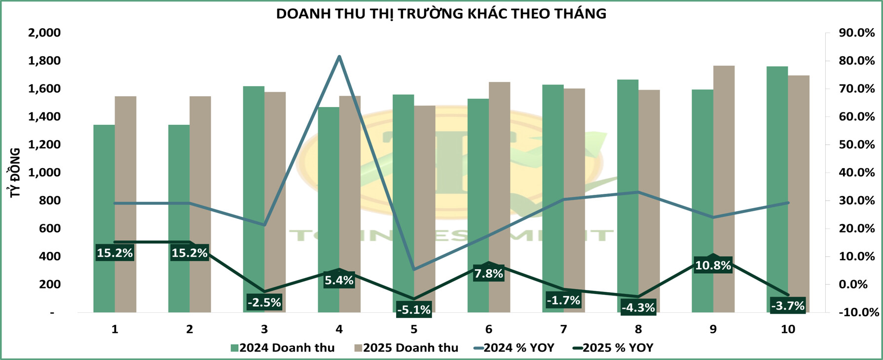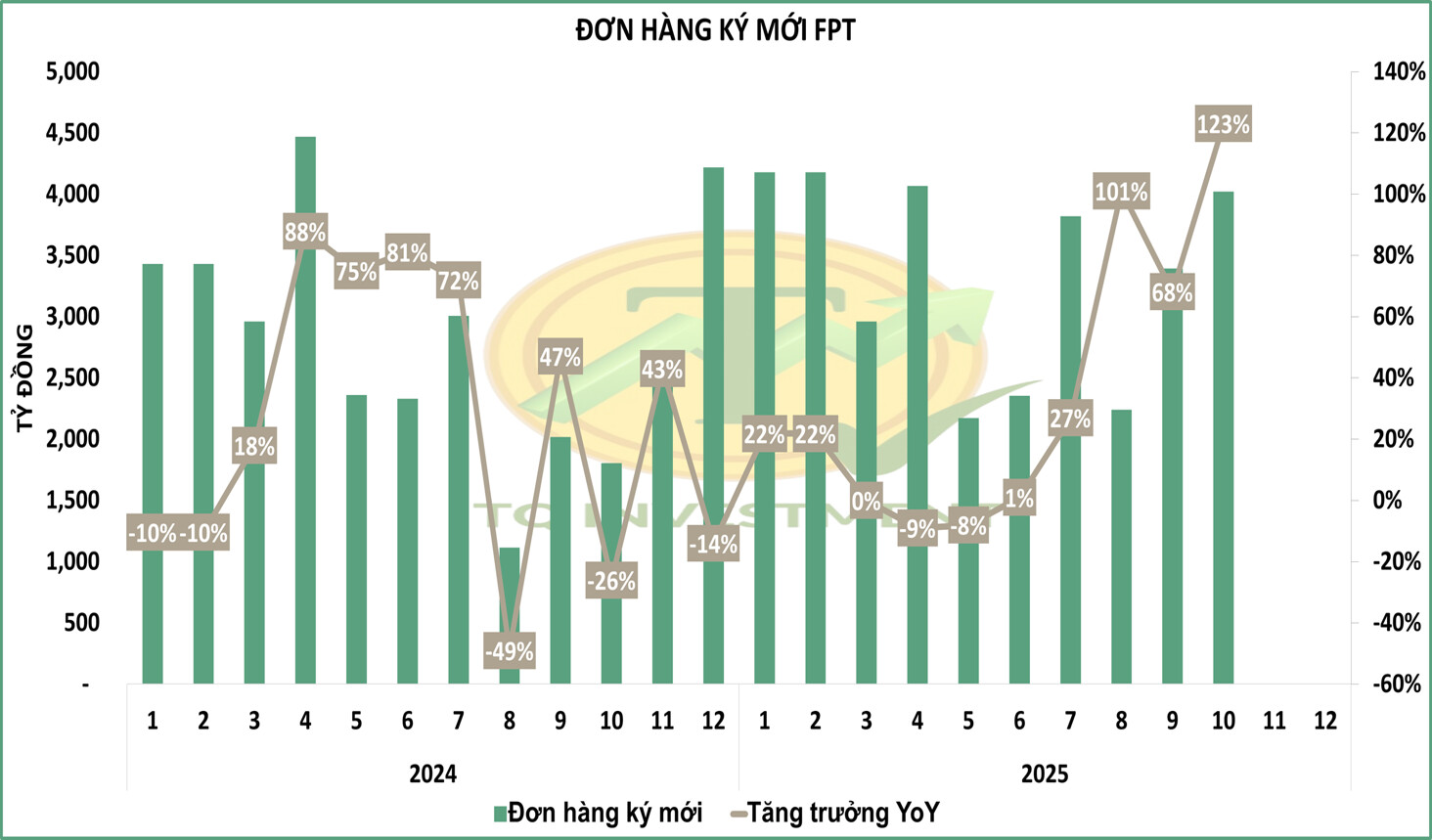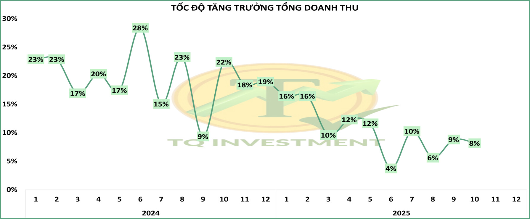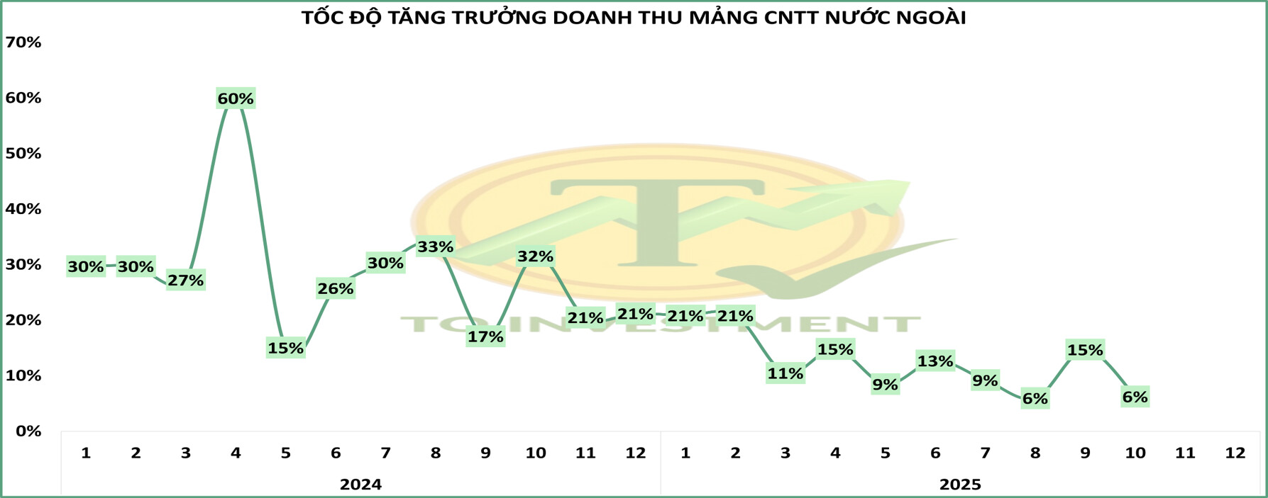 Doanh thu trong 10T/2025 của FPT đạt 55.9k tỷ, +10% SVCK. Với sự tăng trưởng đồng đều ở tất cả các tháng (Hình 5). Nhưng đây lại là mức tăng trưởng chậm lại của FPT so với các năm trước, đặc biệt trong 2024 (Hình 6)