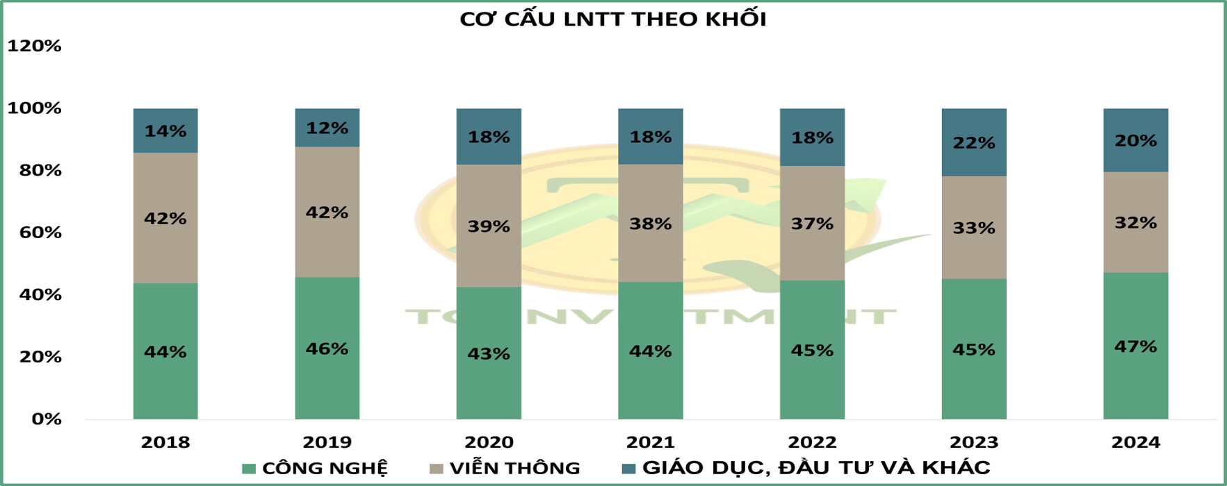 Cơ cấu doanh thu và LNTT: Mảng Công nghệ là hoạt động chính mang lại doanh thu và LNTT cho FPT (Hình 1& 2). Và doanh thu chính của mảng công nghệ FPT đến từ thị trường nước ngoài (Hình 3)