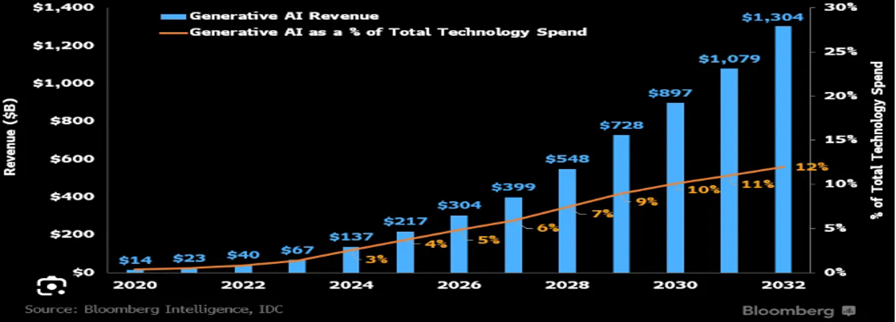 Liệu FPT có quay trở lại xu hướng tăng trưởng mạnh mẽ? Thứ nhất, đã có những dấu hiệu phục hồi về đơn hàng ký mới của FPT từ tháng 7/2025 (Hình 13). Thứ 2, xu hướng tăng trưởng của doanh thu GenAI được Bloomberg dự phóng tăng trưởng rất mạnh trong giai đoạn 2025-2032, khoảng 29%/năm. (Hình 14). Thứ 3, khu vực trong nước cũng sẽ là điều kiện thuận lợi cho FPT khi chính phủ và nhà nước đẩy mạnh việc phát triển về công nghệ. Đặc biệt Nghị quyết 57 đã cụ thể các mục tiêu về chuyển đổi số trong nước với Kinh tế số đạt 30% GDP trong 2030 và 50% GDP trong 2045. => FPT sẽ tiếp tục tăng trưởng mạnh mẽ trong tương lai, sự chững lại trong 2025 chỉ diễn ra trong ngắn hạn.