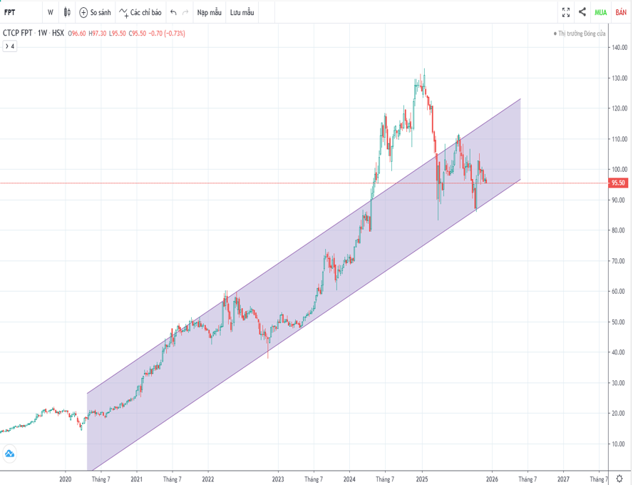 Lý do giá cổ phiếu liên tục sụt giảm từ đầu 2025? Thứ nhất, đến từ việc dòng tiền đầu cơ mạnh vào nhóm công nghệ trong năm 2024 (Tương tự nhóm Magnificent 7), kéo giá cổ phiếu FPT thoát khỏi kênh tăng giá bền vững từ 2020. (Hình 12). Bên cạnh đó, sự sụt giảm về tốc độ tăng trưởng trong 2025 cũng góp phần kéo giá FPT liên tục lao dốc khi những kỳ vọng được đẩy lên quá cao và không được đáp ứng.