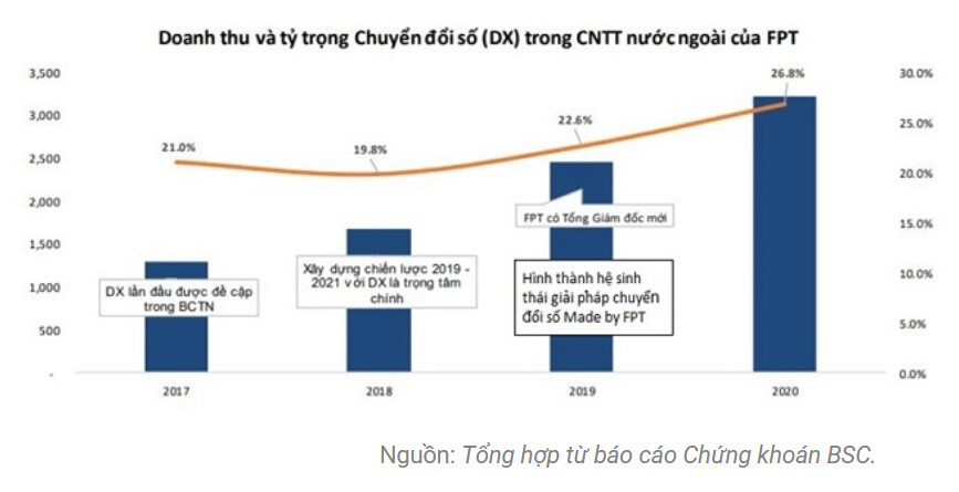 Doanh thu từ chuyển đổi số của FPT năm 2020 đạt 3.219 tỷ đồng, cao hơn 31% so với năm trước đó. Tỷ trọng mảng này trong doanh thu công nghệ thông tin nước ngoài liên tục tăng 3 năm gần đây, đạt 27% trong năm 2020. Hai tháng đầu năm nay, tăng trưởng doanh thu và lợi nhuận trước thuế từ chuyển đổi số là 15% và 17% so với cùng kỳ.