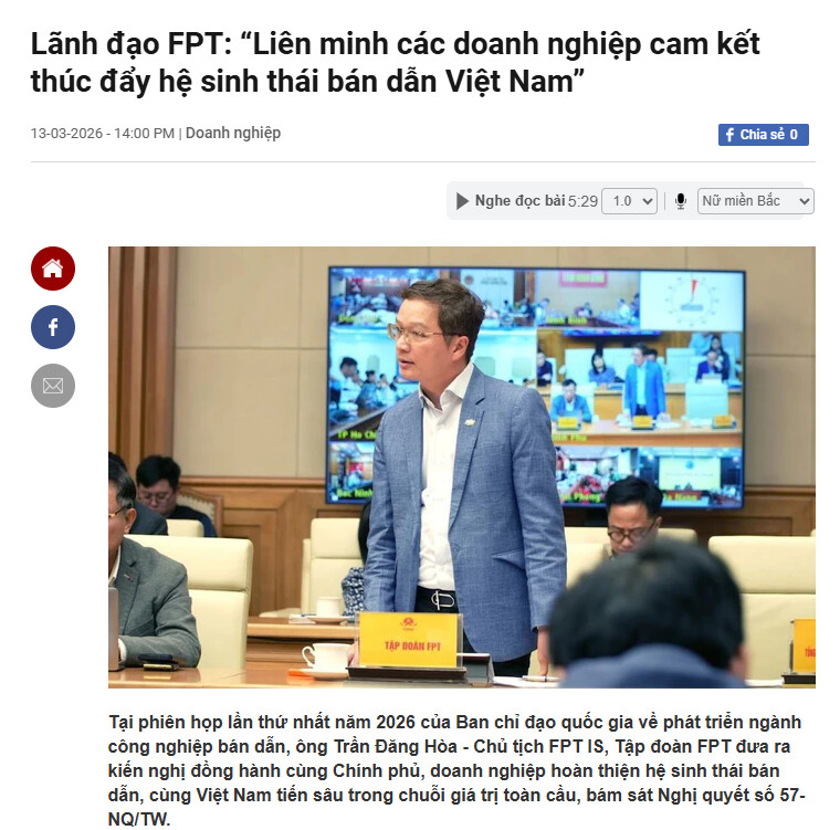 Tại phiên họp Ban chỉ đạo quốc gia về phát triển ngành bán dẫn năm 2026, lãnh đạo FPT cho biết các doanh nghiệp công nghệ Việt đang cam kết liên minh để thúc đẩy hệ sinh thái bán dẫn trong nước, nhằm giúp Việt Nam tham gia sâu hơn vào chuỗi giá trị toàn cầu. FPT đề xuất nhiều giải pháp như hoàn thiện chính sách, phát triển Chip-Lab quốc gia và đào tạo nguồn nhân lực, đồng thời cho biết tập đoàn đã tham gia lĩnh vực bán dẫn hơn 10 năm với các hoạt động thiết kế, đóng gói, kiểm thử chip và đào tạo kỹ sư