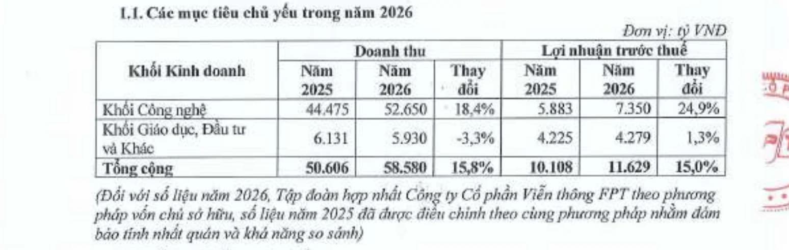 Việc “mất” mảng viễn thông trên sổ sách khiến doanh thu hợp nhất của FPT sụt giảm về mặt con số kỹ thuật. Trong giai đoạn trước, mảng này vốn đóng góp tới gần 30% doanh thu và hơn 30% lợi nhuận cho toàn tập đoàn. Để bù đắp khoảng trống này, FPT đặt kỳ vọng tối đa vào sự dẫn dắt của khối Công nghệ. Mục tiêu doanh thu năm 2026 được đặt ra là 58.580 tỷ đồng và lợi nhuận trước thuế 11.629 tỷ đồng. Con số này tương đương mức tăng trưởng 15% so với cùng kỳ sau khi đã điều chỉnh cách tính mới.