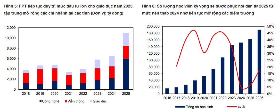 tăng 19% svck, thấp hơn kế hoạch là 26%, đến từ sự doanh thu thị trường Mỹ chỉ đạt 9% svck cùng các đơn hàng ký mới chậm lại; 2) Mảng giáo dục ghi nhận tăng trưởng khiêm tốn 6.7% svck trong 2T25, số tăng trưởng học viên bắt đầu chậm lại từ 2024. Tuy nhiên, LNTT vẫn duy trì mức tăng trưởng như dự báo đạt 21% svck, hỗ trợ bởi biên LN cải thiện mạnh mẽ ở tất cả các mảng. Với chiến lược cắt giảm chi phí, ngừng tuyển mới đồng thời cải thiện năng suất lao động từ ứng dụng AI trong 2025 sẽ hỗ trợ cải thiện biên LN.