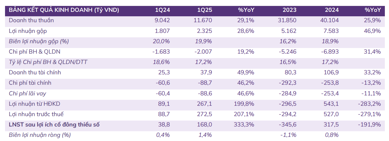 Tổng LNTT của FRT đạt 272,5 tỷ đồng, tăng gấp 3 lần svck. Năm 2025, FRT đặt kế hoạch doanh thu và LNTT lần lượt 48.100 tỷ đồng và 900 tỷ đồng. Với KQKD Q1/2025 tích cực, FRT đã hoàn thành 24,3% kế hoạch doanh thu và 30,3% kế hoạch LNTT đặt ra cho năm 2025.