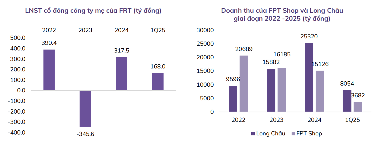 Doanh thu thuần Q1/2025 của FRT đạt 11.670 tỷ đồng (+29,1% svck), LN trước thuế và lãi vay (EBIT) đạt 361 tỷ đồng (+142% svck). Long Châu tiếp tục là động lực tăng trưởng chính.