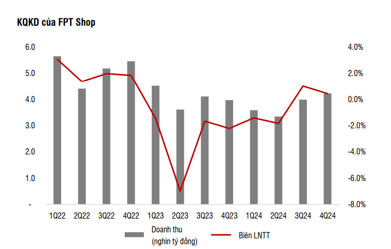 Sau giai đoạn khó khăn năm 2023, FRT đã phục hồi mạnh mẽ trong 2024 nhờ Long Châu tăng trưởng bùng nổ và FPT Shop quay lại có lãi. Năm 2025, công ty được kỳ vọng tiếp tục tăng trưởng lợi nhuận hai chữ số, trong đó Long Châu là động lực chính và FPT Shop hưởng lợi từ chu kỳ điện thoại cùng kế hoạch mở rộng điện máy. Tôi giữ quan điểm Khả quan, với giá mục tiêu 220.000 đồng/cổ phiếu.