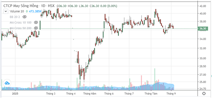 Trong Q2-2025 cổ phiếu bị ảnh hưởng khá nặng bởi thuế quan nhưng sau đó đã hồi phục khá tốt trong tháng 6 và qua đó giúp mức sụt giảm chỉ khoảng 10% so với đầu quý. Tuy nhiên điều này cũng ảnh hưởng khá lớn tới KQKD mảng tự doanh của FTS khiến cho công ty ghi nhận mức âm 10.2 tỷ đồng trong Q2. Hiện trong Q3 trong khi cả thị trường đều có xu hướng tăng giá khá mạnh thì giá cổ phiếu MSH vẫn gần như đi ngang so với cuối Q2-2025. (Hình 7)