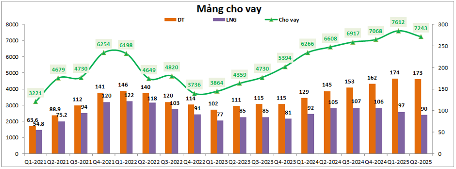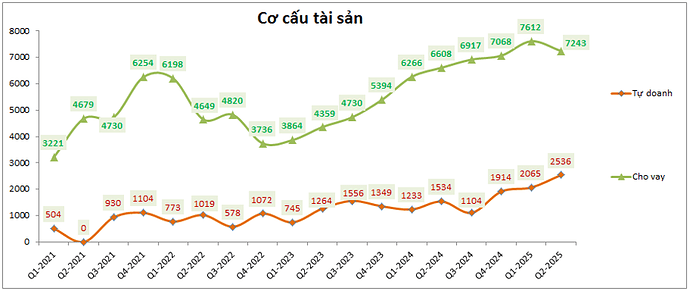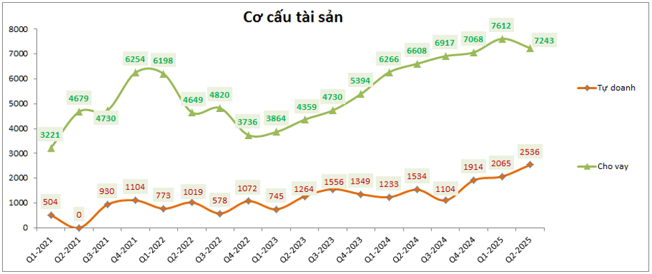 Trong nhiều năm qua FTS vẫn duy trì và định hướng cho vay là mảng quan trọng nhất để duy trì, thúc đẩy cho tăng trưởng của công ty. Vì thế công ty cũng dành phần lớn tài sản của mình vào mảng cho vay của công ty. Cụ thể tính tới cuối Q2-2025 tổng tài sản cho vay của FTS đạt 7,243 tỷ đồng, chiếm tới 64.2% tỉ trọng tài sản của công ty. (Hình 3)