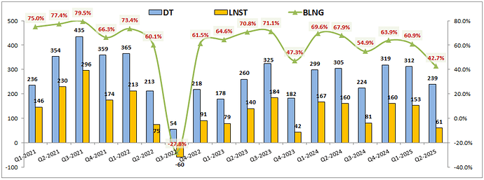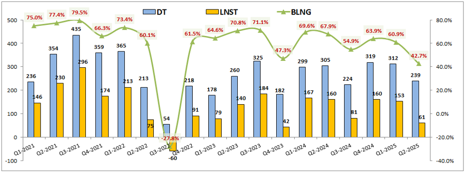 Sau giai đoạn suy giảm chung theo thị trường năm 2022 thì KQKD của FTS đã có phần phục hồi từ 2023 cho tới nay. Tuy nhiên trong năm 2024 và nửa đầu 2025 KQKD của FTS không bứt phá được mà vẫn đi ngang so với 2023, thậm chí KQKD vẫn chưa thể vượt được 2021. Cụ thể Q2-2025 FTS ghi nhận doanh thu 239 tỷ đồng, giảm 21.6% yoy. Lợi nhuận sau thuế ghi nhận chỉ 61 tỷ đồng, giảm tới 61.9% yoy. (Hình 1)