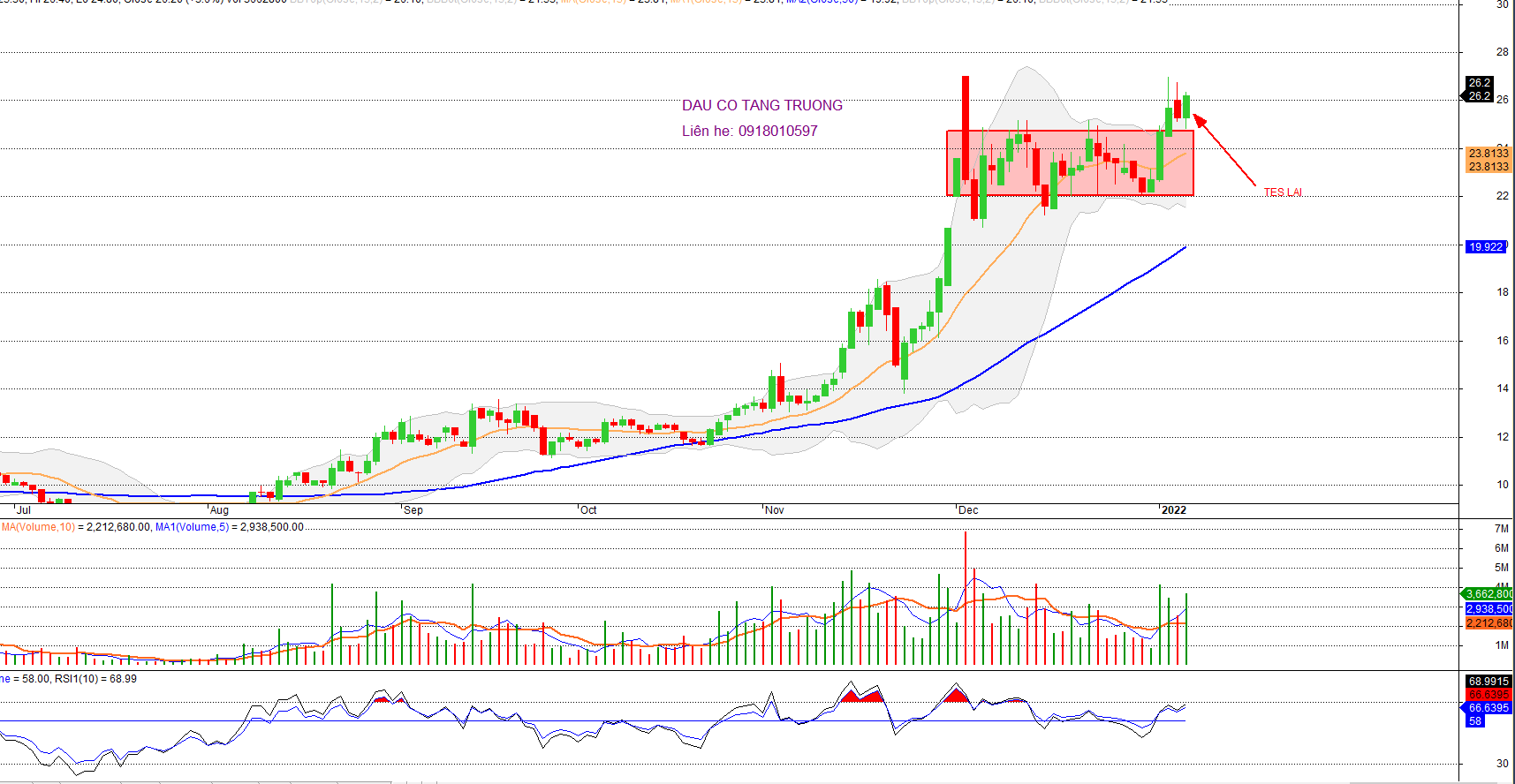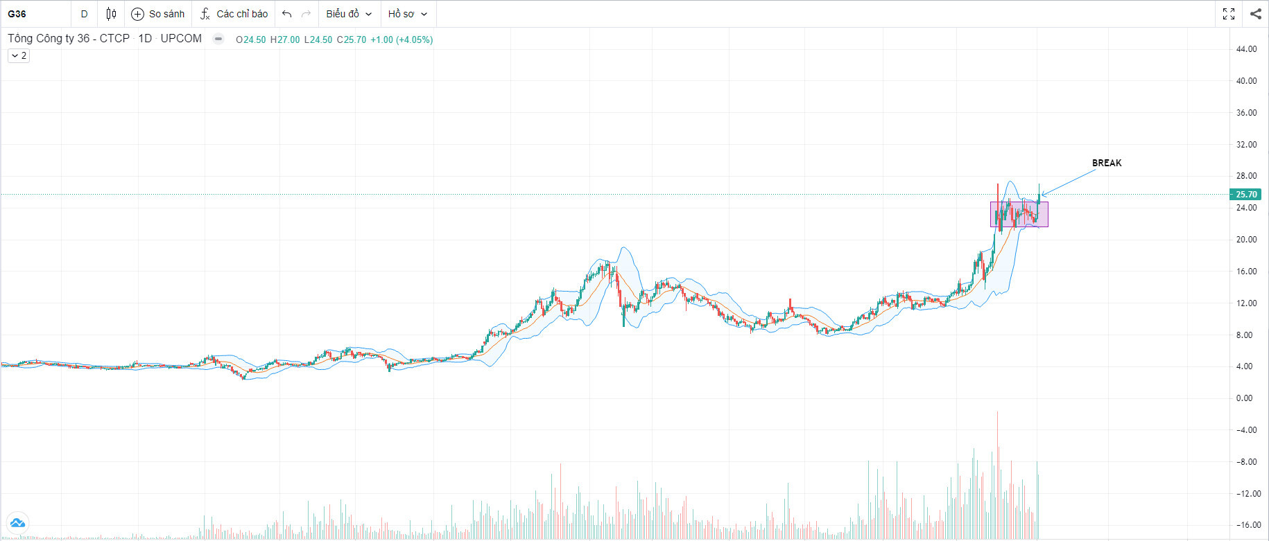 Sau quá trình đi ngang từ đầu năm tới tháng 11/2021 và hoàn tất mẫu hình rũ bỏ Vai Đầu Vai, G36 có một nhịp tăng mạnh lên vùng giá 21.5-25 và đang tạo một nền giá tại đây. Cổ phiếu đang tích lũy lại và cho tín hiệu volume siết chặt dần trong tháng 12. CHO TÍN HIỆU BREAK NỀN GIÁ