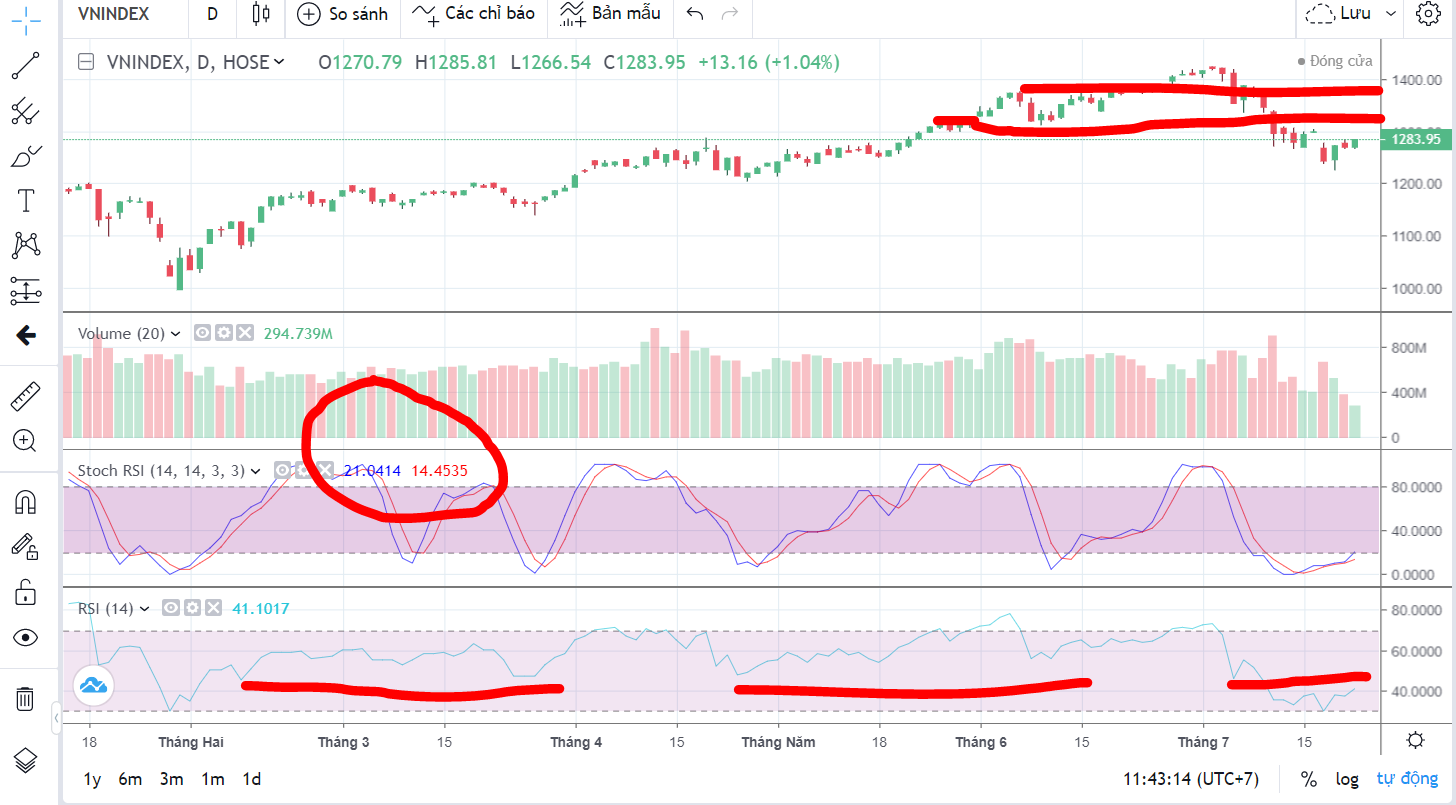 Vậy nếu vượt qua được mức kháng cự 1330-1340 thì xác định xu hướng tăng ngắn hạn, cùng với RSI lớn hơn 45-50 cùng với thanh khoản mạnh theo Stochastic RSI giữ được xu thế (lớn hơn tầm 20k tỉ / phiên)