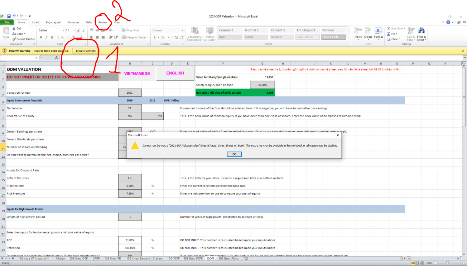 Em ENABLE CONTENT để chạy Macro, sau đó nếu sheet khóa thì vào review để bỏ bảo vệ sheet.