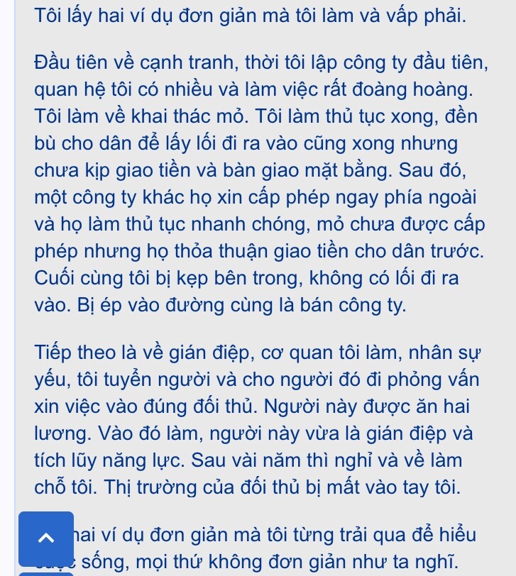 Tiếp theo là về gián điệp, cơ quan tôi làm, nhân sự yếu, tôi tuyển người và cho người đó đi phỏng vấn xin việc vào đúng đối thủ. Người này được ăn hai lương. Vào đó làm, người này vừa là gián điệp và tích lũy năng lực. Sau vài năm thì nghỉ và về làm chỗ tôi. Thị trường của đối thủ bị mất vào tay tôi.