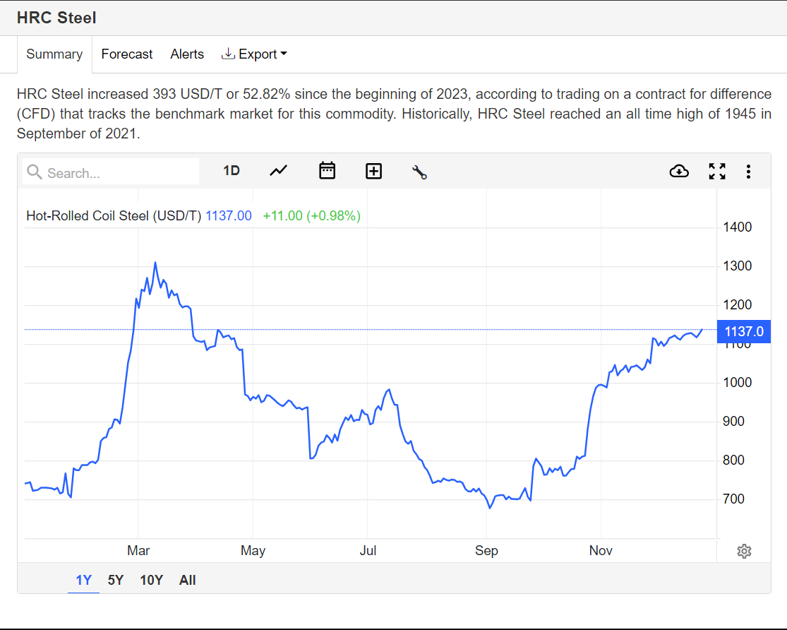 Tuy nhiên, với nhu cầu về thép về cuối năm trên thế giới, giá HRC đã tăng mạnh từ khoảng cuối tháng 9 cho tới cuối tháng 12, dao động từ 697 đến 1126 USD/tấn. Nên hoàn toàn có thể kỳ vọng vào doanh thu cuối năm của GDA có thể bật một cách mạnh mẽ nếu doanh nghiệp tiếp tục duy trì sản lượng xuất khẩu trung bình ở mức 30.000-35.000 tấn/tháng (tương đương với sản lượng xuất khẩu trung bình trong 6T23).