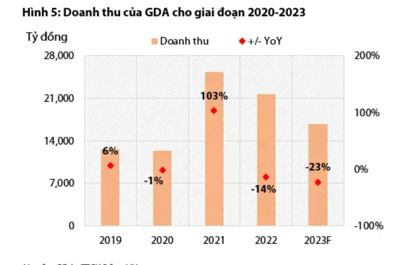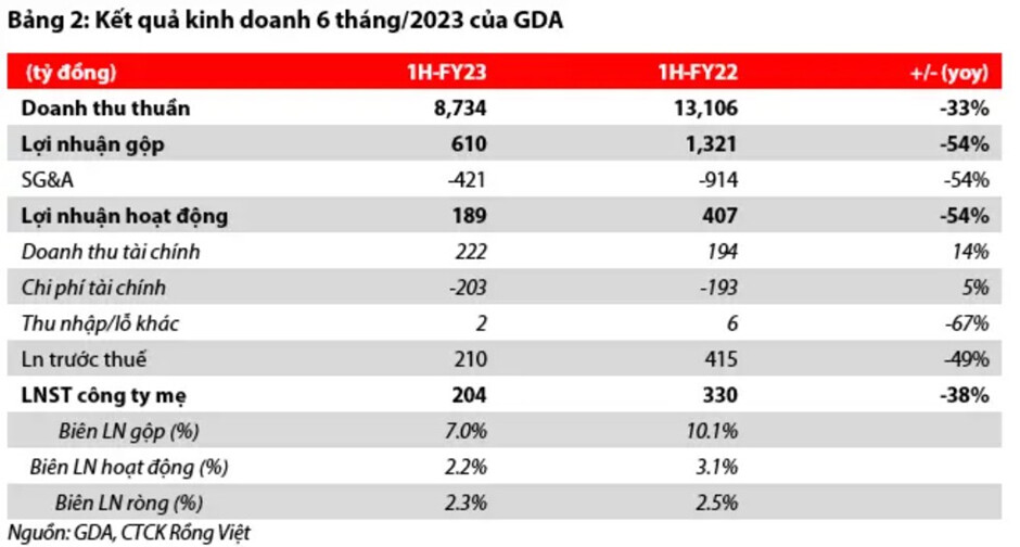 Trong 6 tháng/2023, GDA ghi nhận doanh thu 8.734 tỷ đồng (-33%YoY), với sản lượng bán ra là 376,6 nghìn tấn (-8%YoY, hoàn thành ~50% kế hoạch kinh doanh); và ~65% khối lượng tiêu thụ là sang thị trường nước ngoài (ASEAN, EU là các thị trường chính) do nhu cầu tiêu thụ gia tăng ở các quốc gia này, đặc biệt là kể từ Quý 2/2023.