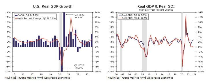 Tổng thu nhập quốc nội thực tế (GDI) chỉ tăng 1,5% trong quý 3. Thực tế, tốc độ tăng trưởng GDI thực tế đã tụt lại so với tốc độ tăng trưởng GDP thực tế trong bốn quý liên tiếp. So với cùng kỳ năm trước, GDP thực tế tăng 3,0% trong khi GDI thực tế giảm 0,2% . Tăng trưởng chi tiêu tiêu dùng thực tế, tăng 2,3% so với cùng kỳ năm trước trong quý 3, vấn đề lớn có thể xảy ra nếu tăng trưởng thu nhập thực tế vẫn còn yếu. Mặc dù tiền lương danh nghĩa và lương tăng 5,6% (so với cùng kỳ năm trước) trong Quý 3, nhưng lạm phát cao đang làm xói mòn sự tăng trưởng của sức mua thực tế.