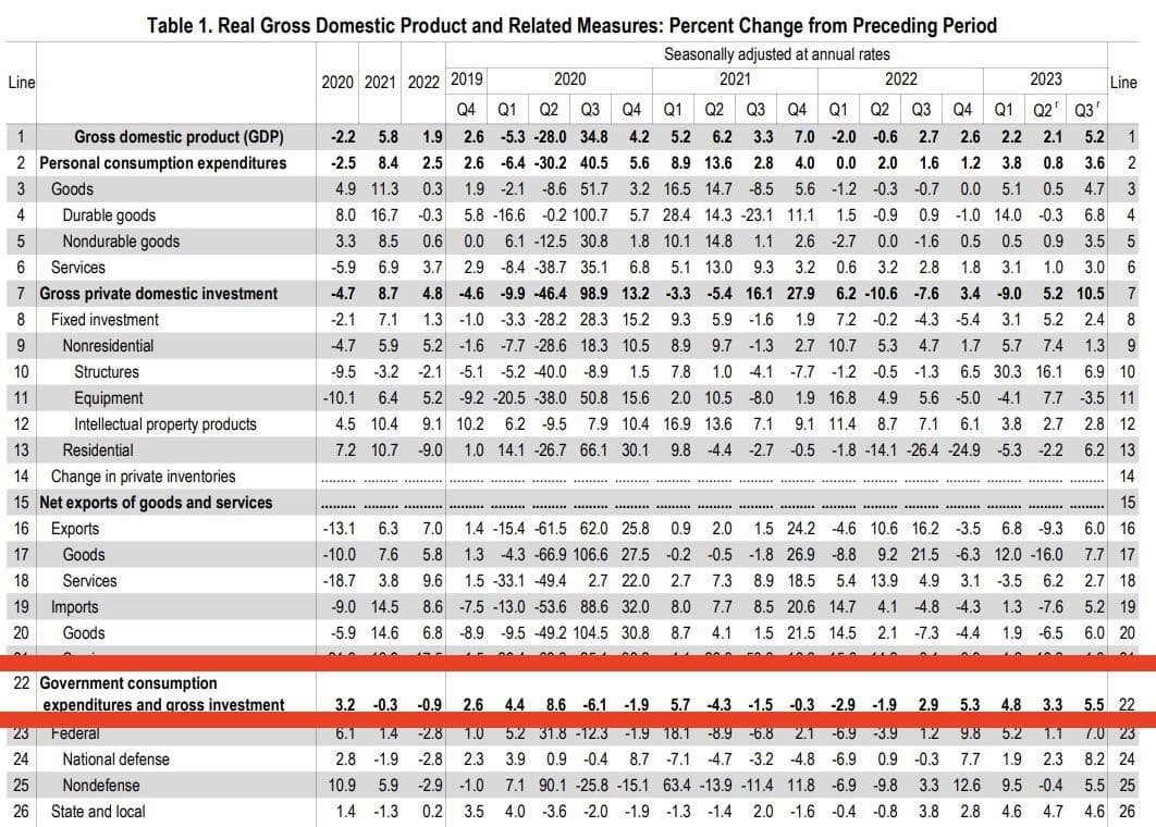 Dữ liệu sửa đổi được công bố hôm qua cho thấy GDP thực tế tăng trưởng với tốc độ hàng năm là 5,2% trong quý 3-2023 so với quý trước, cao hơn ước tính ban đầu là 4,9% được báo cáo một tháng trước. Mặc dù Cục Phân tích Kinh tế (BEA) đã điều chỉnh tốc độ tăng trưởng chi tiêu tiêu dùng cá nhân thực tế (PCE) xuống 3,6% từ 4,0%, nhưng tốc độ tăng trưởng chi tiêu đầu tư cố định thực tế không yếu như báo cáo ban đầu. Hơn nữa, dữ liệu sửa đổi cho thấy chi tiêu thực tế của chính phủ đã tăng 5,5% trong quý 3, tăng so với tốc độ tăng trưởng 4,6% được báo cáo ban đầu.Chi tiêu của chính phủ vẫn là vấn đề nhức nhối chưa thể giải quyết của chính quyền Joe Biden.