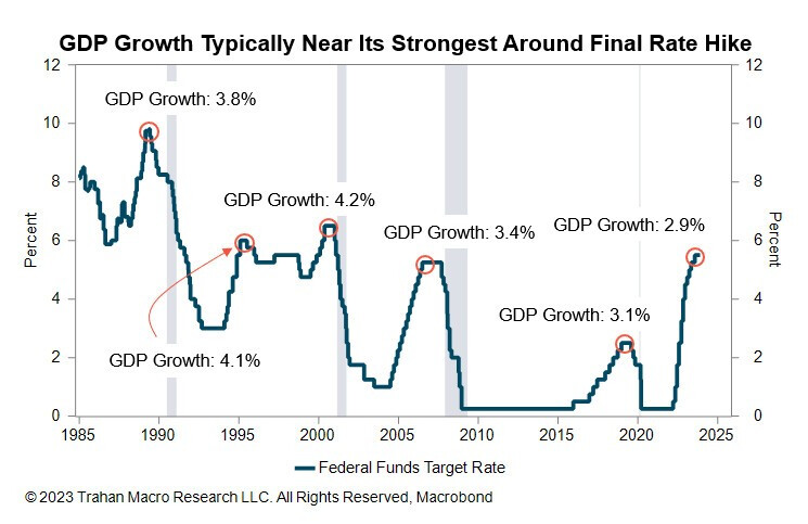 Việc nền kinh tế hoạt động tốt vào cuối chu kỳ thắt chặt của Fed là điều bình thường. Trên thực tế, tăng trưởng GDP thực tế đạt trung bình 3,7% vào cuối năm trong chu kỳ thắt chặt gần đây nhất,chớ nên vội mừng.