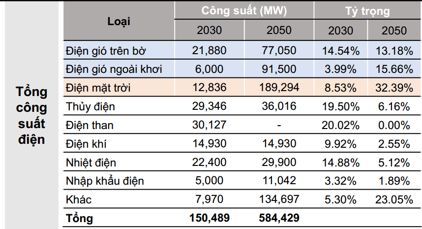 Giai đoạn 2020 – 2024, tổng sản lượng điện sản xuất và nhập khẩu tăng trưởng 4.3%/năm. Trong đó điện năng lượng tái tạo như điện gió, điện mặt trời và điện sinh khối tăng trưởng một cách vược trội → ngành điện VN đang dịch chuyển theo xu hướng của thế giới. Tầm nhìn đến 2050, năng lượng tái tạo (đứng đầu là điện gió + năng lượng mặt trời) là mảng tăng trưởng mạnh mẽ nhất từ tỷ trọng 8,53% năm 2030 lên 32,39% đến năm 2050 và là chủ lực chính trong sản xuất điện.