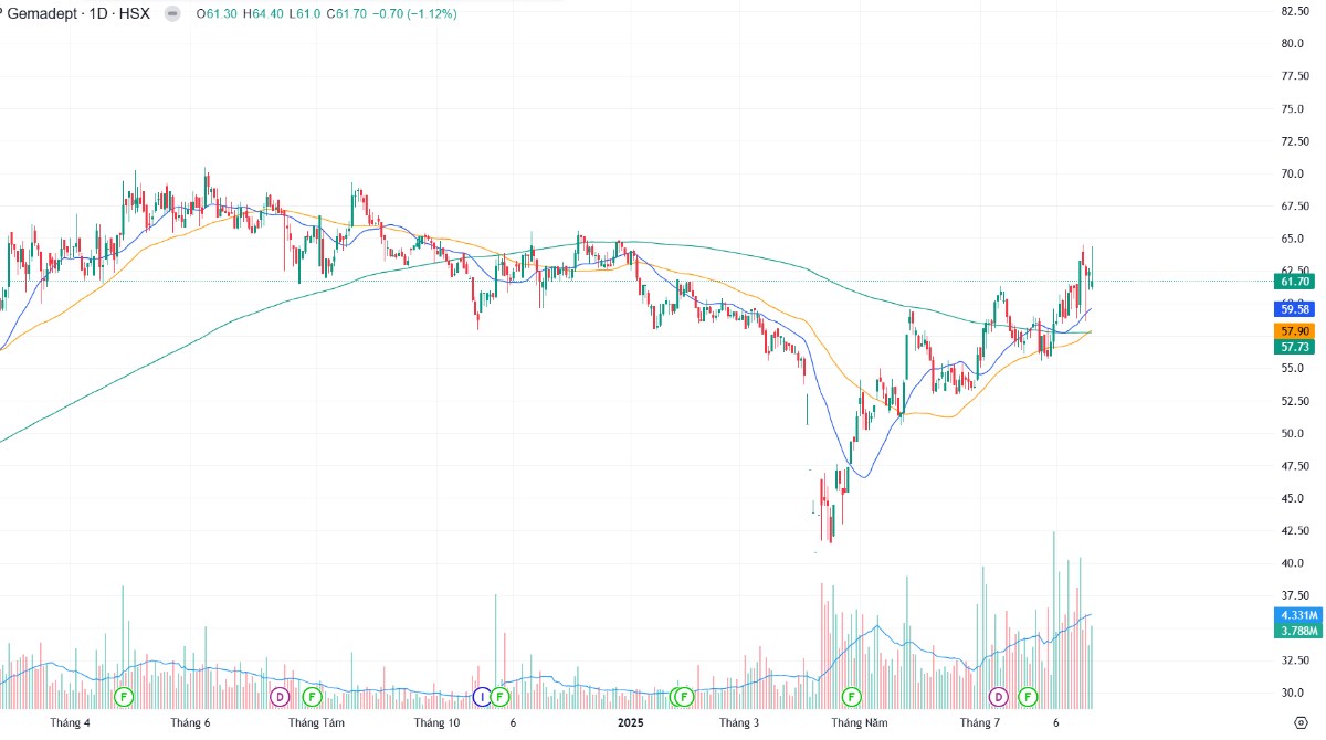 Sau giai đoạn giảm mạnh từ tháng 10/2024 đến tháng 3/2025 (tạo đáy quanh vùng 38–40), cổ phiếu GMD đã có nhịp hồi phục ấn tượng.