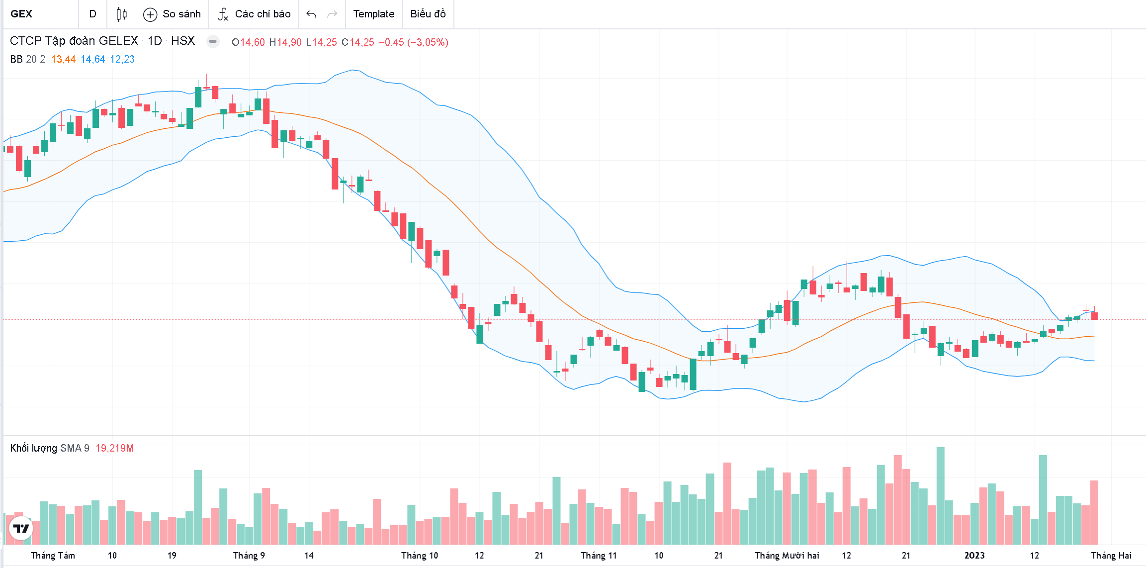 GEX bám bollinger band ==> mua 14 đến 14.2 break 16 là bầu trời, cutloss 13.8