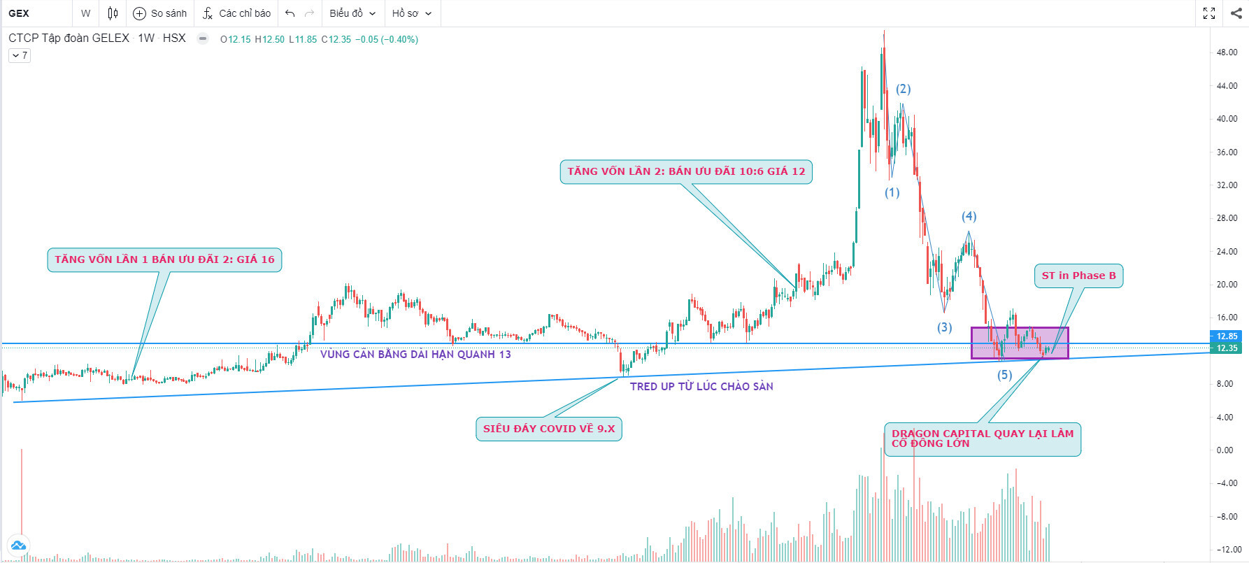 VỀ KĨ THUẬT: GEX đang vận động về trend tăng dài hạn tính từ 2015 trở lại đây. Với 6 tháng vận động quanh 13.x vùng cân bằng dài hạn. Hoàn thành bước sóng giảm và đang tạo điểm ST in Phase B trong chu kì vận động của Wyckoff