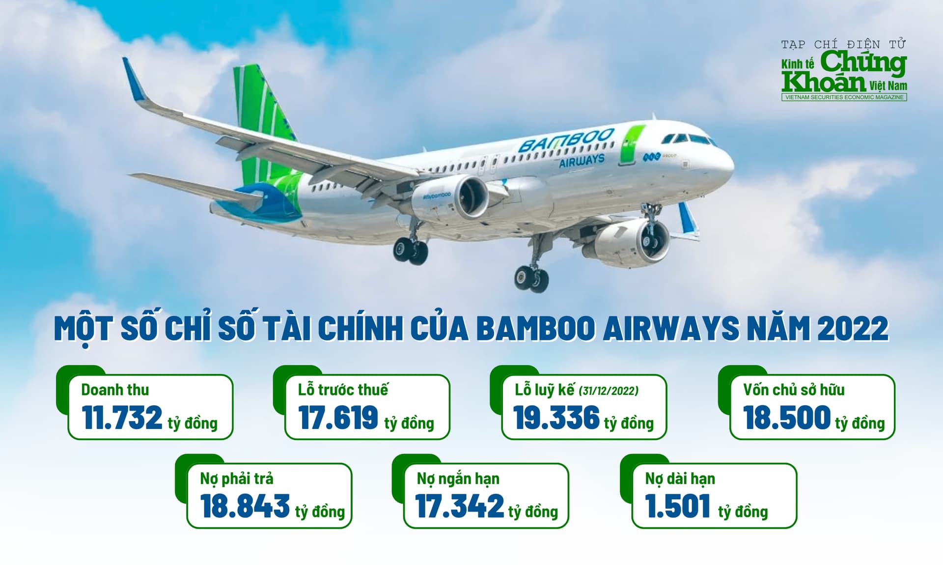 Chi phí quản lý doanh nghiệp và chi phí tài chính tăng mạnh trong khi doanh thu tài chính giảm khiến Bamboo Airways ghi nhận tổng lỗ trước thuế năm 2022 cao kỷ lục, lên tới 17.619 tỷ đồng, gấp 7,7 lần năm 2021. Kết quả kinh doanh này đẩy tổng lỗ lũy kế tại ngày cuối năm 2022 lên mức 19.336 tỷ đồng, vượt qua vốn chủ sở hữu đang ở mức 18.500 tỷ đồng.