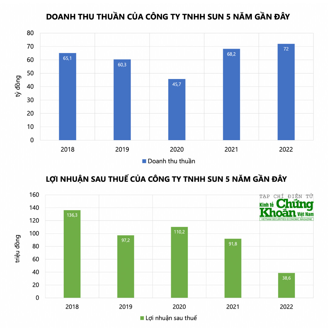 Theo dữ liệu của Kinhtechungkhoan.vn, năm 2022, Công ty TNHH Sun ghi nhận doanh thu thuần đạt gần 72 tỷ đồng, cao nhất trong 5 năm gần đây. Tuy nhiên, lợi nhuận sau thuế chỉ đạt vỏn vẹn 38,6 triệu đồng, giảm 58% so với năm 2021, xuống mức thấp nhất trong 5 năm qua.