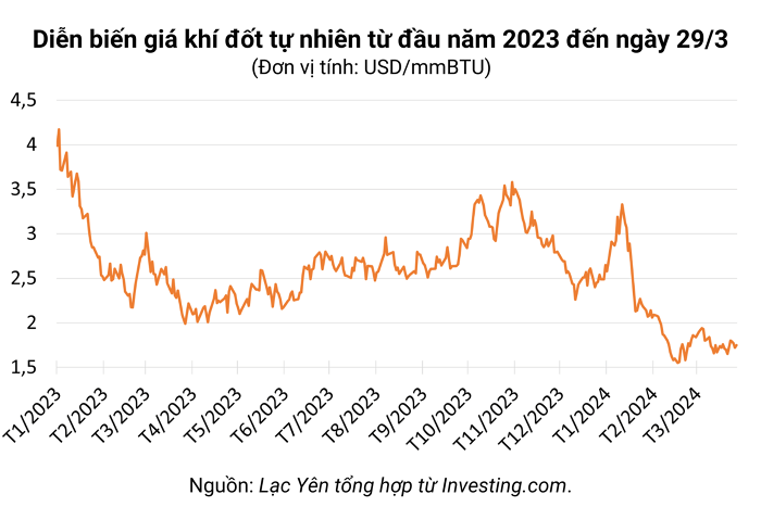 Giá gas hôm nay (29/3) tăng 1,98%, lên mức 1,75 USD/mmBTU đối với hợp đồng khí gas tự nhiên giao tháng 5/2024 vào lúc 8h30 (giờ Việt Nam).