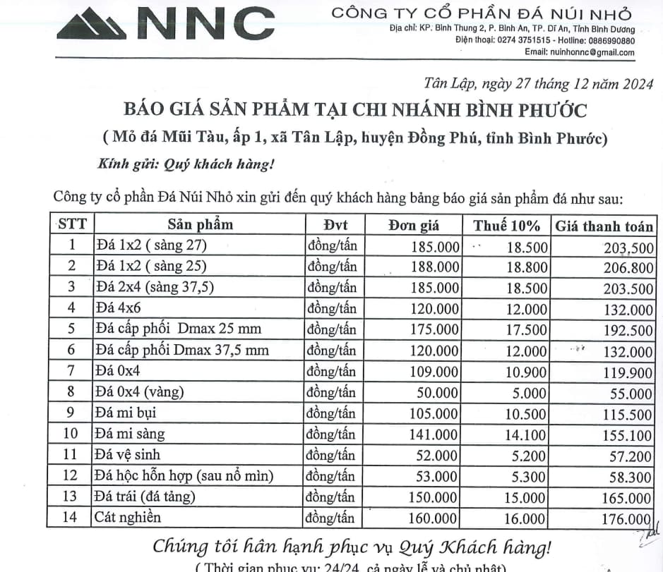 Giá bán đá tháng 1-2025: