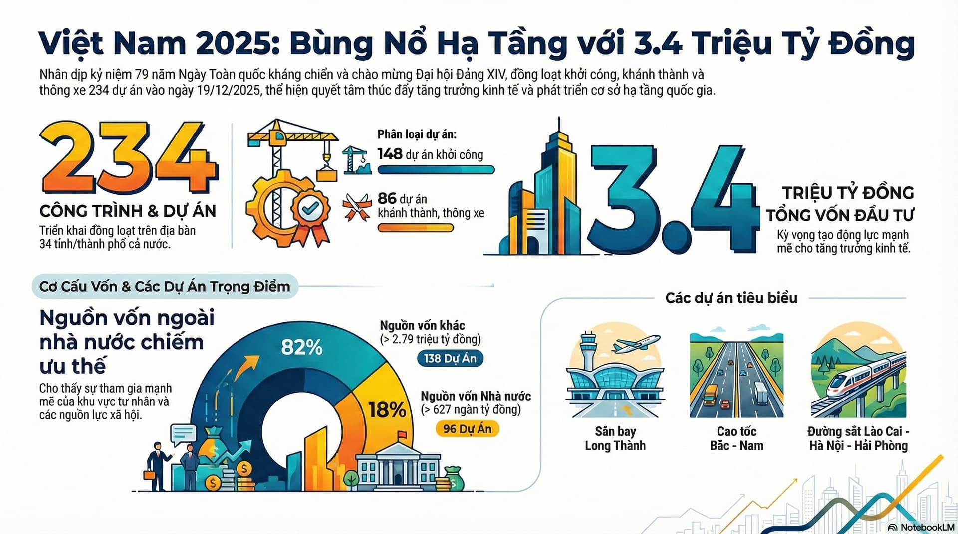 Việt Nam bước vào năm 2025 với một khí thế hạ tầng chưa từng có, khi hàng trăm công trình và dự án trọng điểm được đồng loạt khởi công, khánh thành trên khắp cả nước. Quy mô đầu tư lên tới hàng triệu tỷ đồng không chỉ thể hiện quyết tâm chính trị mạnh mẽ, mà còn gửi đi một thông điệp rõ ràng về khát vọng bứt phá dài hạn. Hạ tầng không còn là câu chuyện nền móng đơn thuần, mà trở thành “đường băng” cho tăng trưởng, mở ra không gian phát triển mới cho công nghiệp, logistics, đô thị và liên kết vùng.