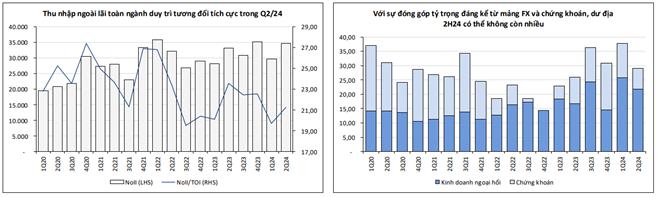 - Thu nhập ròng ngoài lãi phục hồi 18% QoQ nhờ thu từ nợ xấu đã xử lý và Bancassurance. Đóng góp lớn nhất đến từ BID VPB – ghi nhận khoản lãi bất thường từ bán chứng khoán đầu tư. Tuy nhiên, 2H2024 khó duy trì cao do tính chu kỳ