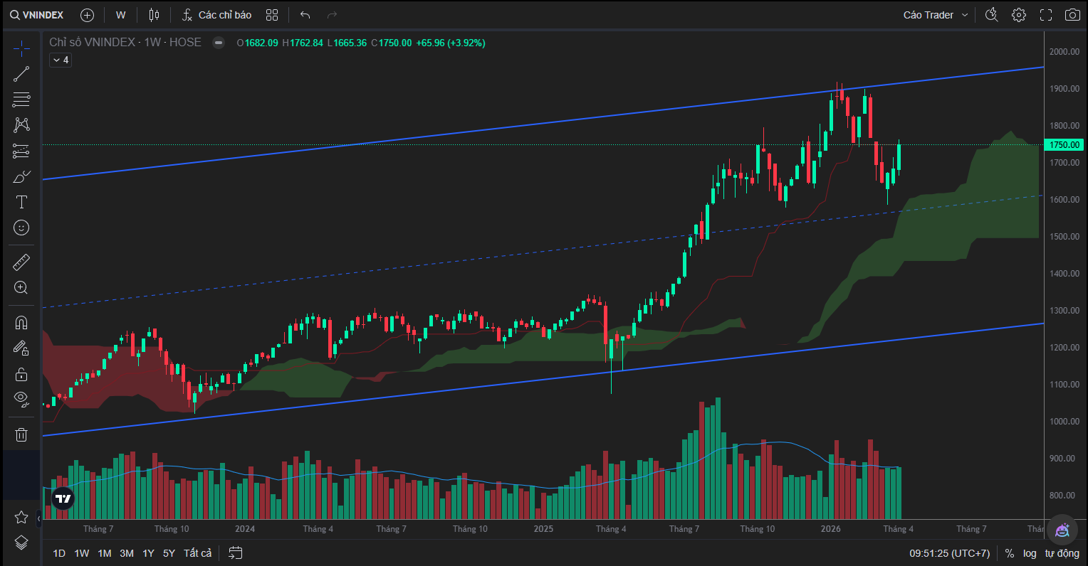 Xét trên khung tuần, xu hướng tổng thể của VNINDEX vẫn là một xu hướng tăng rõ ràng và chưa có tín hiệu đảo chiều. Giá hiện vẫn duy trì phía trên mây Ichimoku, xác nhận cấu trúc bullish trong trung hạn.