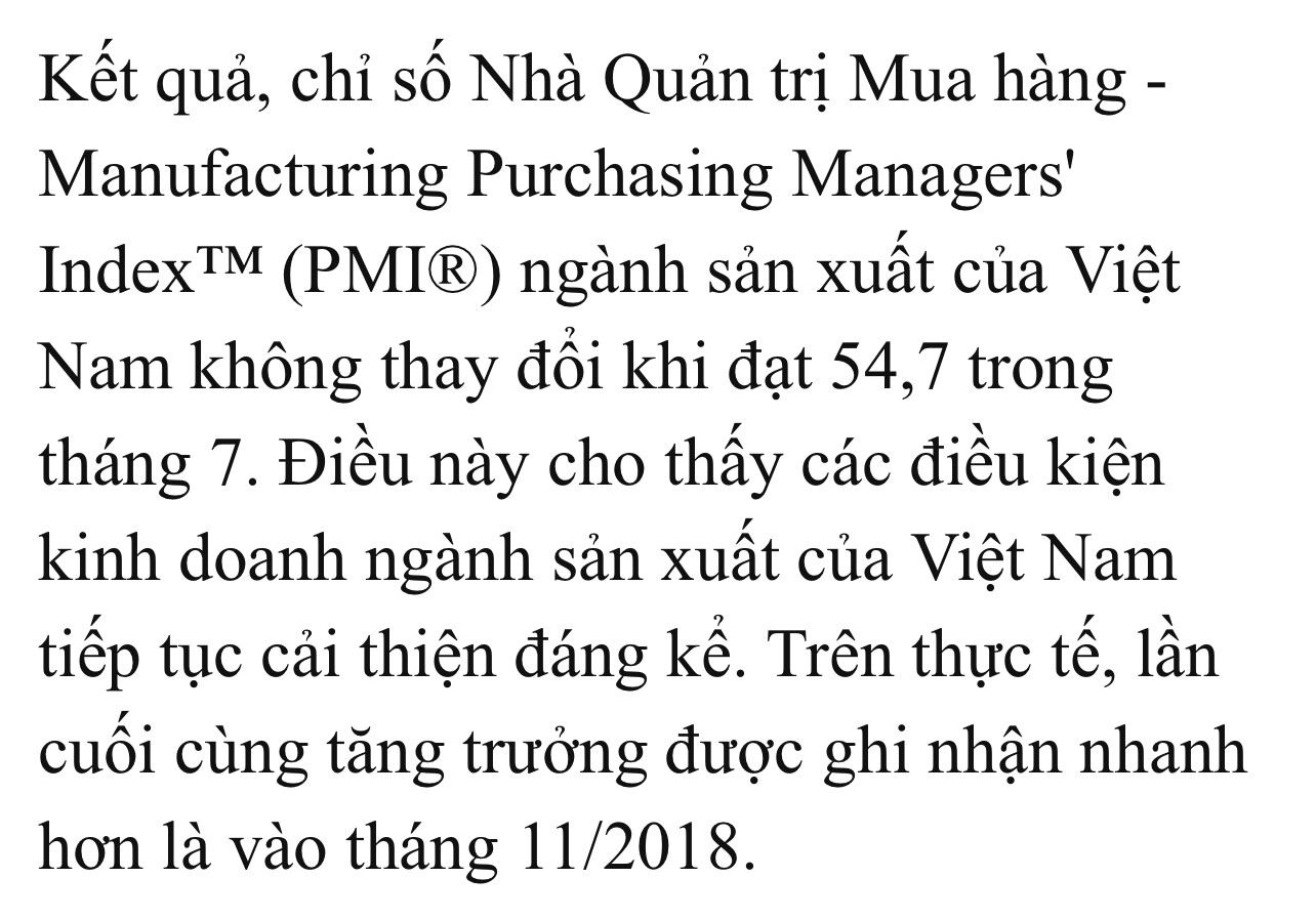 PMI của VN trong tháng 7 đạt 54.7 điểm: