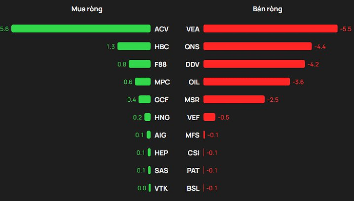 Chiều mua, cổ phiếu ACV được khối ngoại mua 5,6 tỷ đồng. Theo sau, HBC và F88 cũng được mua ròng mỗi mã vài trăm triệu đồng.
