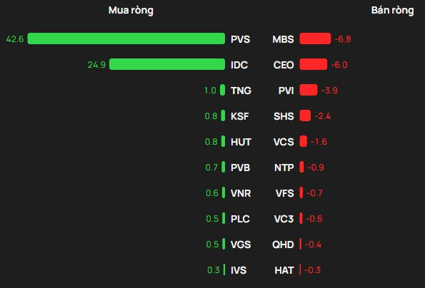 Tại chiều mua, PVS được mua ròng mạnh nhất với giá trị 42 tỷ đồng. Bên cạnh đó, IDC xếp tiếp theo trong sách mua ròng mạnh trên HNX với 24,9 tỷ đồng. Ngoài ra, khối ngoại cũng chi vài tỷ đồng để gom ròng TNG, KSF, HUT.
