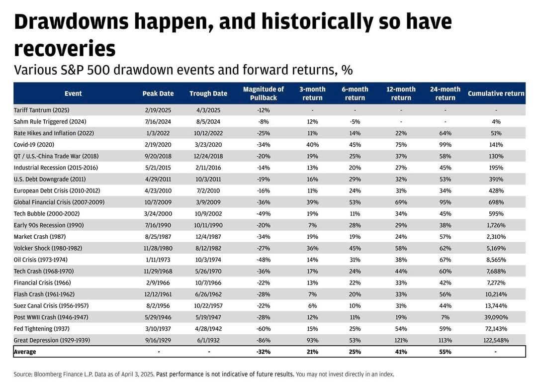 - Lịch sử cũng cho thấy S&P 500 đã trải qua gần 20 cuộc khủng hoảng lớn nhỏ, với mức giảm trung bình khoảng -32%. Nhưng chỉ mất từ 6 tháng đến 1 năm, thị trường đã quay lại mặt bằng cũ – và thường hồi phục mạnh mẽ 41% đến 55% trong vòng 2 năm sau đó. Những ai rời bỏ thị trường trong cơn hoảng loạn, họ không chỉ mất tiền – họ mất luôn cả cơ hội. Mình không nói thị trường Việt Nam sẽ giống hệt như Mỹ. Nhưng quy luật tâm lý con người, quy luật cung – cầu, quy luật chu kỳ thì không thay đổi. Chúng ta đã thấy điều đó năm 2020. Đã thấy lại vào năm 2022. Và có thể, đang thấy thêm một lần nữa.