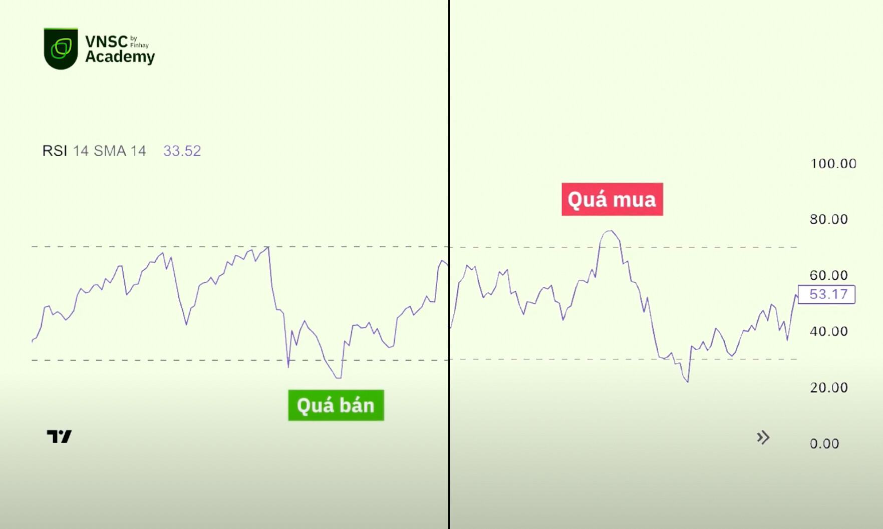 - Thông thường, chỉ báo này sẽ biến động ở giữa mức 30 và 70 - đây được coi là vùng trung tính. Nếu RSI lơn hơn 70 hoặc nhỏ hơn 30 sẽ tạo ra khái niệm là Quá mua và Quá bán