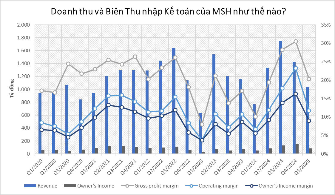 Về KQKD thì Quý 1/2025 MSH ghi nhận doanh thu hơn 1000 tỷ đồng, LNST 87 tỷ đồng, tăng lần lượt 43,5% và 81% svck năm 2024, và thường MSH sẽ có KQKD tốt vào Quý 3.