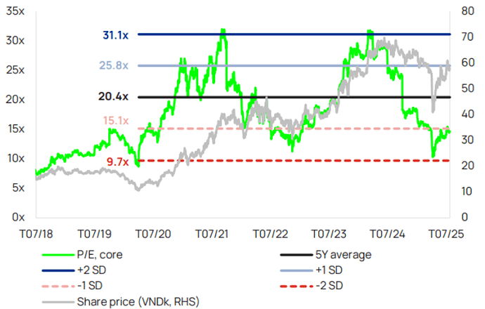 Tuy vậy thị trường đang tiềm ẩn nhiều rủi ro khi nhiều nhà đầu tư đang chờ đợi vào kết quả nâng hạng, cũng như việc thị trường đang cần những câu chuyện nổi bật hơn để dòng tiền mạnh quay trở lại giao dịch. Vì thế, chúng tôi không đưa ra khuyến nghị mua mới trong giai đoạn này mà cần chờ những tín hiệu rõ ràng hơn về dòng tiền. Chúng tôi cũng sẽ chờ thêm báo cáo Q3 để đánh giá mức ảnh hưởng của thuế quan lên tình kinh doanh của những nhóm cổ phiếu bị ảnh hưởng trực tiếp như GMD.