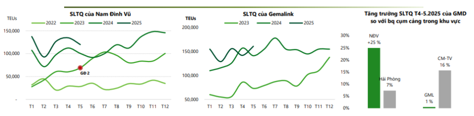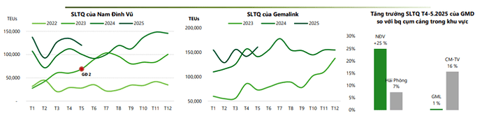 - Nam Đình Vũ GĐ3: Dự kiến hoàn thành xây dựng vào đầu Q3/25. GMD kỳ vọng hiệu suất năm 2026 đạt 50% (khoảng 400k TEU), 2027 hoạt động từ 80-100% công suất.