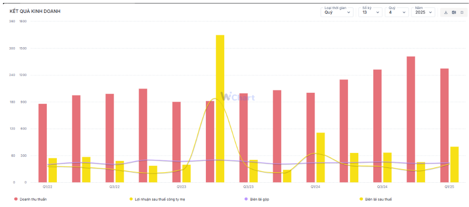Ngoài ra, GMD cho biết cũng duy trì cổ tức 20% tiền mặt. Khoản tiền và tương đương tiền trong Q1/25 đạt mức 4.808 tỷ đồng, duy trì ở mức kỷ lục sau khi thoái vốn thành công và hoàn thành kế hoạch phát hành cho cổ đông hiện hữu. Cơ cấu tài chính ổn định như hiện nay giúp doanh nghiệp vừa có khả năng mở rộng, nâng cao công suất khai thác, vừa giúp doanh nghiệp duy trì mức trả cổ tức khá tốt cho cổ đông.