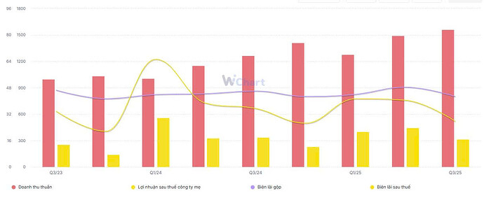 Doanh thu từ hoạt động tài chính tăng mạnh và đạt gần 50 tỷ đồng (+968% yoy), chủ yếu do cục tiền gửi tăng trong những quý gần đây. Nguồn tài trợ cho khoản tiền gửi chủ yếu đến từ vay tài chính dài hạn khi tính đến cuối Q3/25, tổng nợ dài hạn ghi nhận 2.076 tỷ đồng.