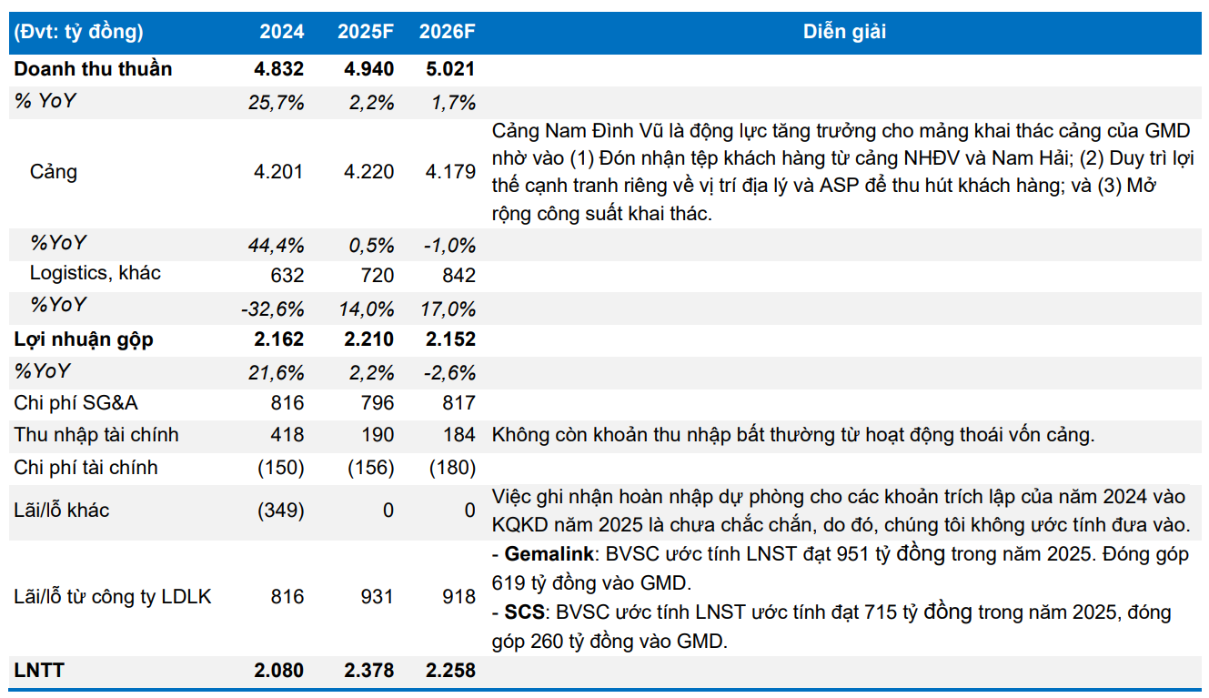 - Các dự án mở rộng vẫn đúng tiến độ: BVSC cho rằng Gemalink GĐ 2A (dự kiến vận hành vào năm 2027 giúp Gemalink nâng công suất lên 2 triệu TEUs), và 2B (dự kiến đưa vào hoạt động năm 2029, nâng công suất cảng lên 3 triệu TEUs) sẽ đạt được hiệu suất sử dụng cảng 65% và duy trì mức 65-70% các năm tiếp theo, nhờ vào: