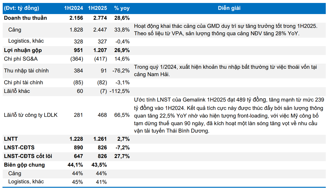 GMD ghi nhận KQKD 1H2025 với doanh thu đạt 2.774 tỷ đồng (+28,6% YoY) và LNST-CĐST đạt 825,6 tỷ đồng (giảm 7,2% YoY). Khi loại trừ thu nhập bất thường từ việc thoái vốn tại cảng Nam Hải vào quý 1/2024, GMD ghi nhận LNST cốt lõi 1H2025 tích cực với mức tăng trưởng là +27,7% YoY. Trong đó, KQKD quý 2/2025 doanh thu đạt 1.497 tỷ đồng (+26,7% YoY), LNST-CĐTS đạt 423 tỷ đồng (+ 39,4% YoY). Lợi nhuận từ công ty LDLK tăng mạnh lên mức 468 tỷ đồng (+66,5% YoY), đóng góp chủ yếu từ Gemalink. Cụ thể, chúng tôi ước tính LNST của Gemalink 1H2025 đạt 489 tỷ đồng, tăng mạnh từ mức 239 tỷ đồng vào 1H2024.