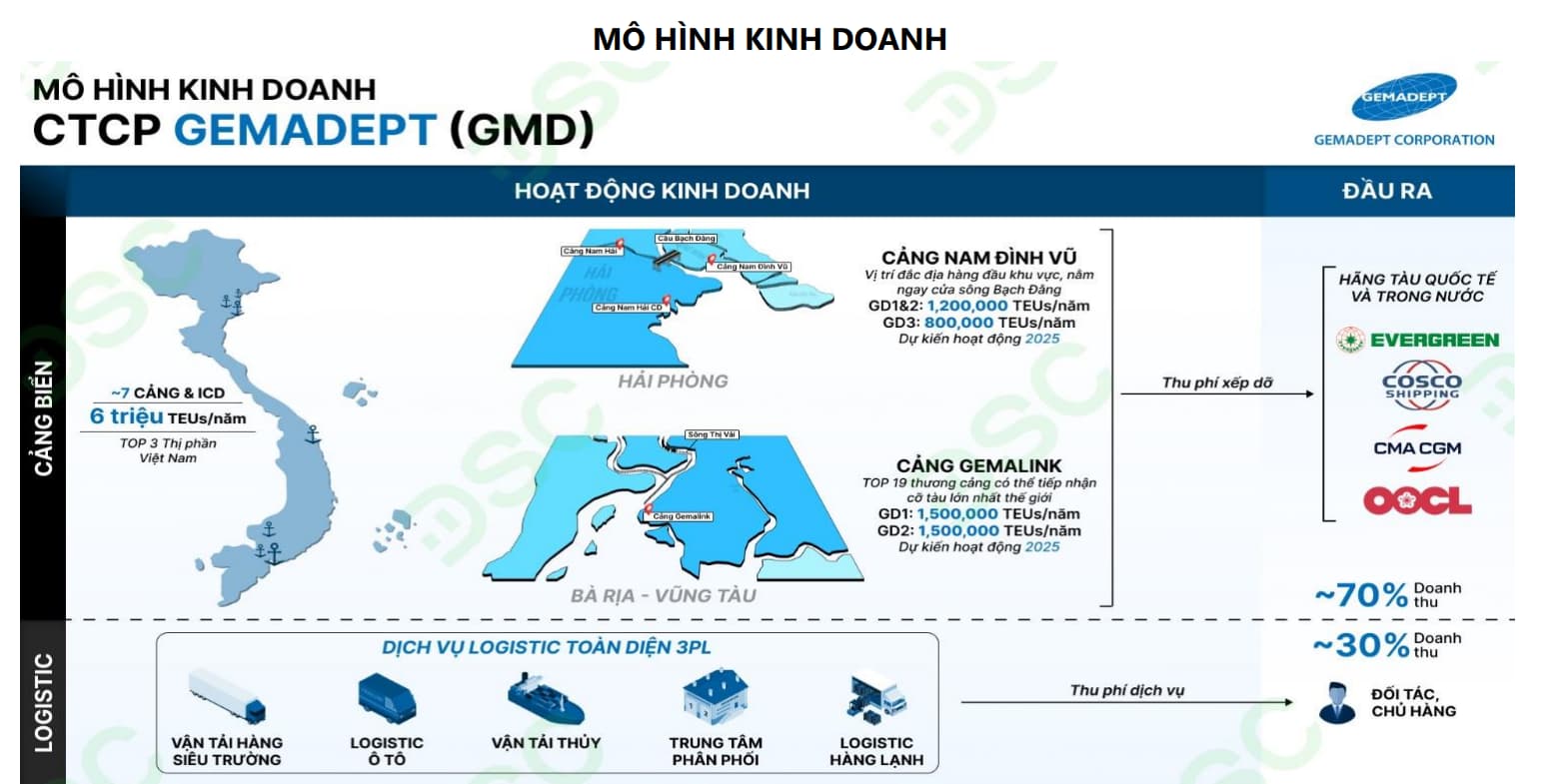 - Công ty cổ phần Gemadept (GMD) là doanh nghiệp dẫn đầu trong lĩnh vực Cảng biển và logistics tại Việt Nam. Hoạt động khai thác cảng đóng vai trò chủ chốt trong cơ cấu doanh thu, đóng góp chủ yếu bởi các cảng nước sâu nằm trong khu vực trọng tâm phát triển của cả nước là Nam Đình Vũ (Hải Phòng) và Gemalink (Cái Mép - Thị Vải).
