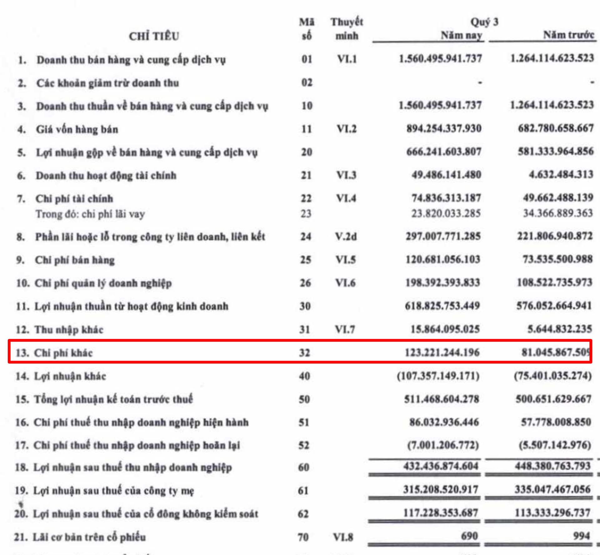 Trong BCTC Q3/2025 của GMD xuất hiện khoản chi phí bất thường trong chi phí quản lý doanh nghiệp, với sự tăng thêm khoảng 100 tỷ trong Q3/2025, GMD vẫn chưa giải trình chi tiết về chi phí này (Hình 6). Bên cạnh đó, có thêm khoản mục chi phí khác khoản 123 tỷ, trong đó chủ yếu là phần trích lập dự phòng cho mảng cao su của GMD (Hình 7). Qua đó đã kéo giảm lợi nhuận trước thuế của GMD còn 511 tỷ, +2% svck mặc dù các hoạt động cốt lõi vẫn tăng trưởng rất tốt.