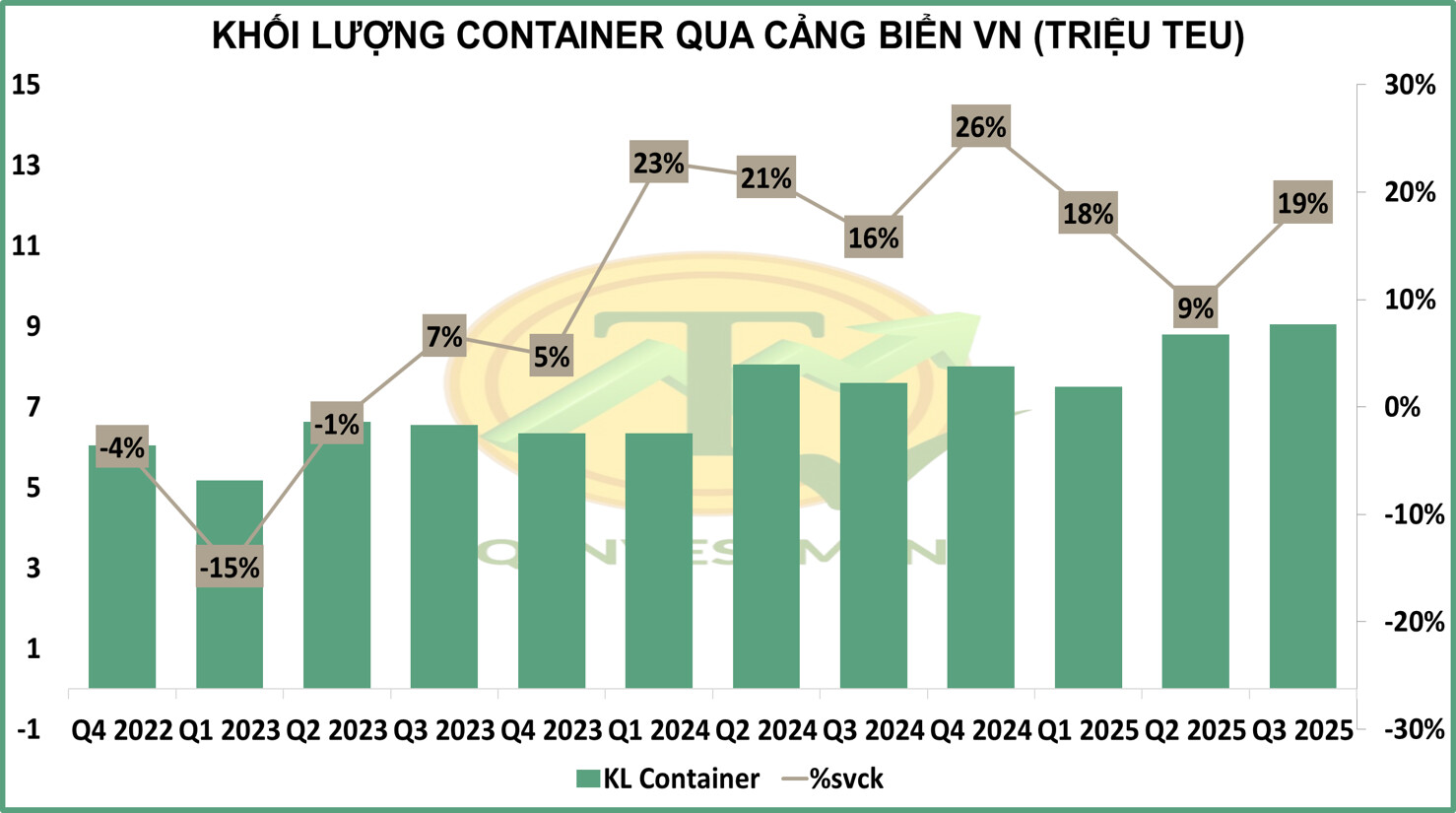 Doanh thu Q3/2025 của GMD đạt 1.56k tỷ, +23% svck. Lũy kế 9T/2025 đạt 4.3k tỷ, +26% svck. (Hình 1) Kết quả đến từ hoạt động kinh doanh chính của GMD là mảng cảng biển duy trì sự tăng trưởng tích cực trong bối cảnh tình hình xuất nhập khẩu cũng như khối lượng Container qua cảng biển VN vẫn tăng trưởng tốt (Hình 2), đặc biệt trong Q3/2025 vẫn khả quan bất kể áp lực thuế quan từ Mỹ. Trong đó động lực đến từ sự tăng trưởng của cảng Nam Đình Vũ tại khu vực miền Bắc, với mức tăng trưởng về sản lượng trên 20% ở các quý. (Hình 3)