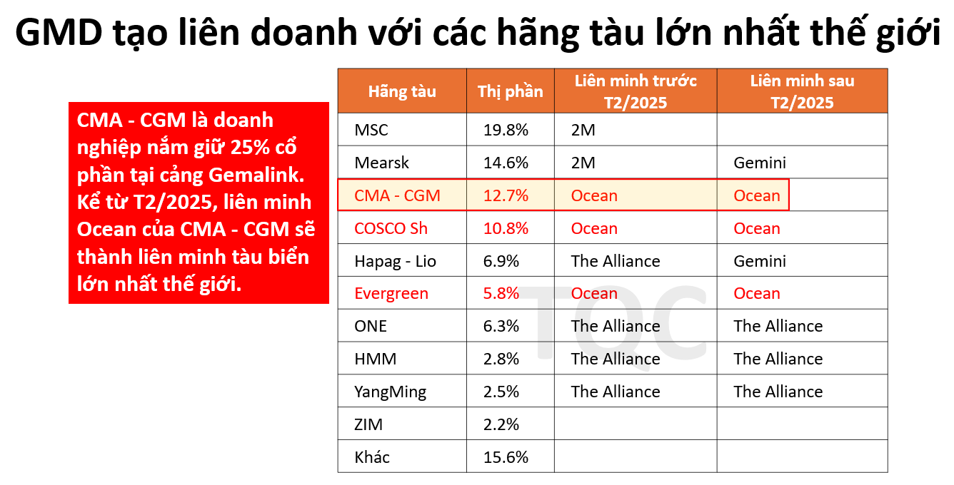 Chiến lược kinh doanh của GMD tại cảng Gemalink là liên doanh với các hãng tàu lớn để cùng hợp tác, phát triển. Hiện nay, CMA – CGM đang nắm giữ 25% cổ phần tại cảng Gemalink. Kể từ T2/2025, liên minh Ocean của CMA – CGM đã thành liên minh tàu biển lớn nhất thế giới, điều này sẽ tạo ra lợi thế cạnh tranh lớn cho cảng Gemalink.